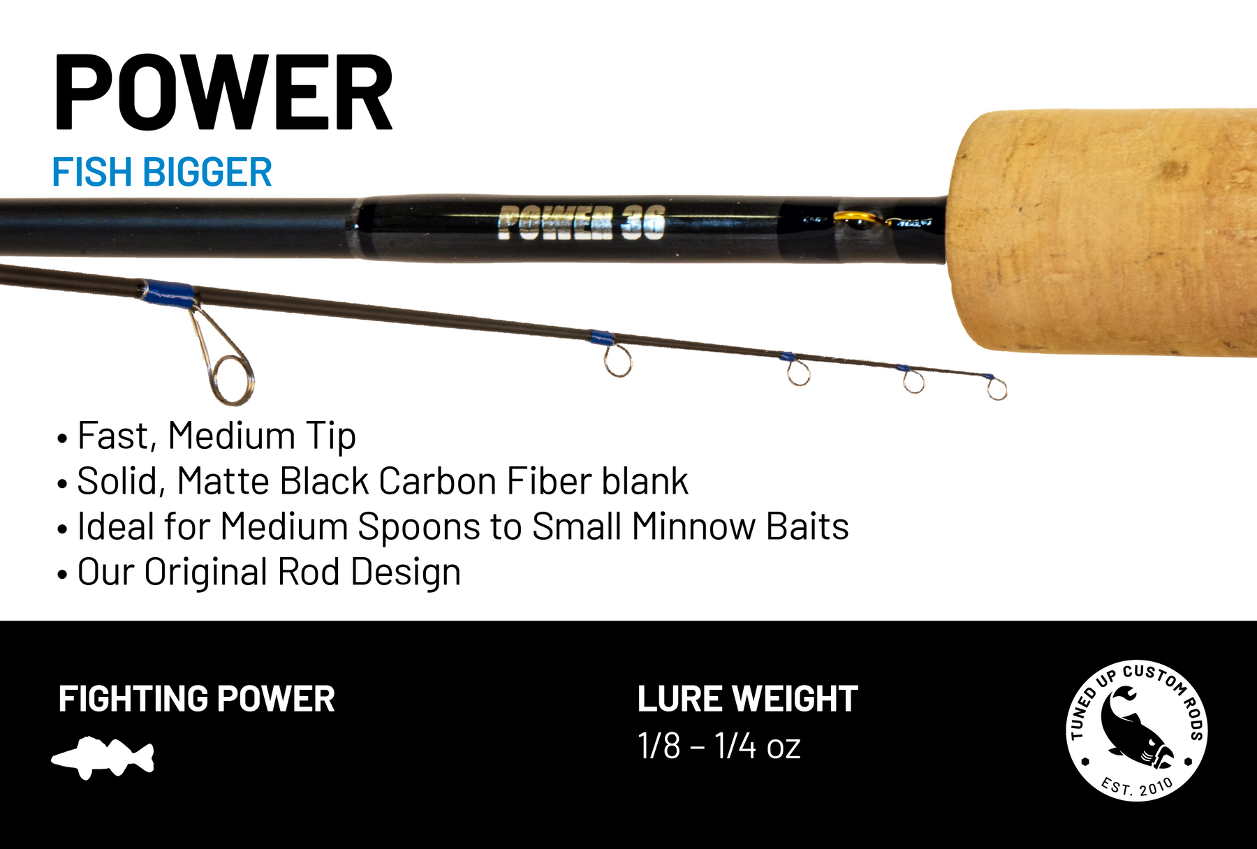 The Power lives up to the name that it bears. Built on a revolutionary blank that features a smooth transition from tip to backbone. This ensures total control over a wide range of lures covering most spoons all the way up to medium sized minnow profile baits, such as #5 Rippn Raps. The Power is designed with enough "Power" to land your next trophy walleye and enough sensitivity to detect even the lightest cold front bites. Featuring stunning Gold REC Recoil Ice guides and all black wraps. This rod stands out on the ice!