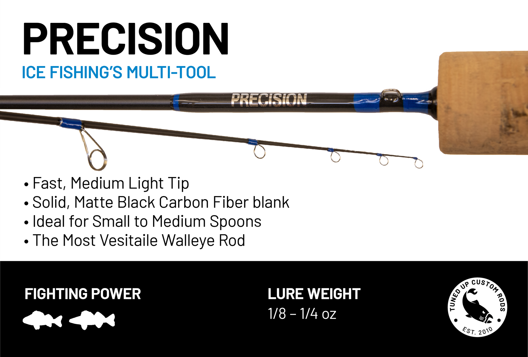 Our quintessential walleye rod. If you are looking for just one rod to meet all your walleye needs, the Precision is the rod for you. Built on a solid carbon fiber blank and featuring a fast, light tip, the Precision is incredibly sensitive and perfectly balanced. This rod can comfortably fish small, medium, and large spoons as well as the small minnow profile baits. Once the hook is set, the rod transitions into a very stout backbone that allows you to fight the fish with perfect control.